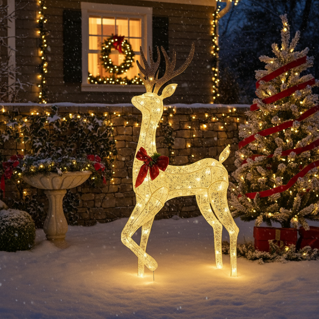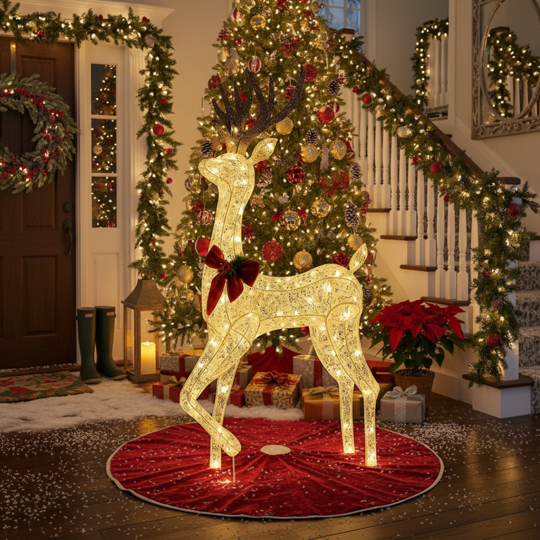 Transforme qualquer ambiente com o brilho mágico do Cervo Iluminado de Luxo, uma peça imponente de 1,52m que traz o espírito natalino com elegância, luz suave e presença marcante.