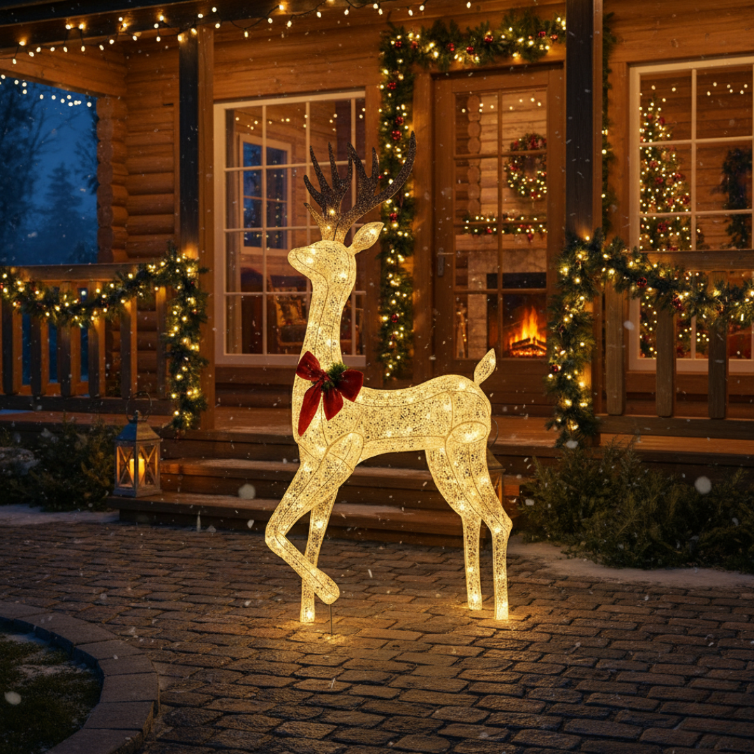 Com micro LEDs de luz branca morna, o cervo cria um espetáculo luminoso que destaca a decoração noturna. Perfeito para halls, jardins, salas amplas e vitrines.