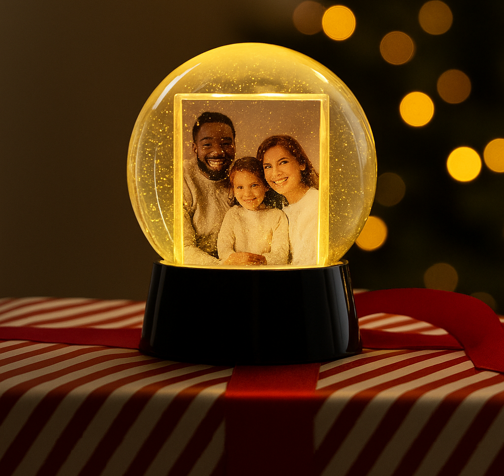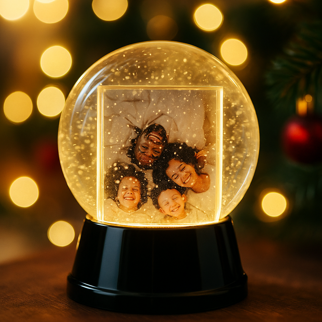 Transforme uma lembrança em decoração natalina: globo de neve com foto impressa, brilho de glitter interno e base preta removível para inserir a imagem no suporte interno.