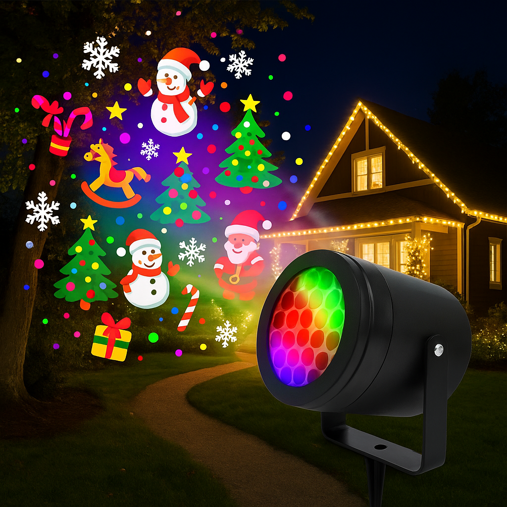 O Projetor Mágico Natalino cria instantaneamente uma atmosfera encantadora, iluminando paredes, salas e jardins com diversos desenhos natalinos vibrantes. São 16 padrões diferentes que projetam desde flocos de neve até Papai Noel, renas e árvores iluminadas — tudo com um brilho intenso e colorido que encanta adultos e crianças.
