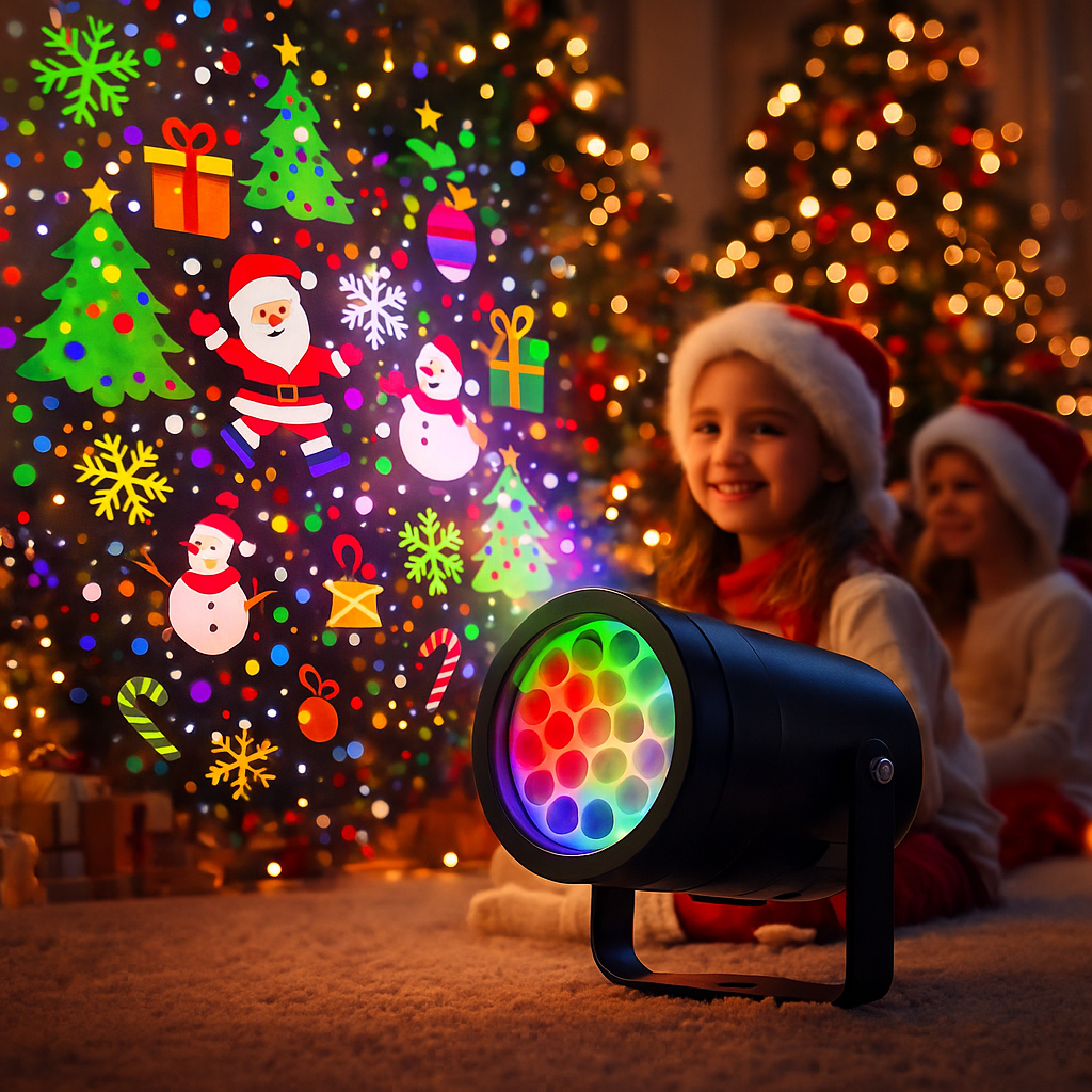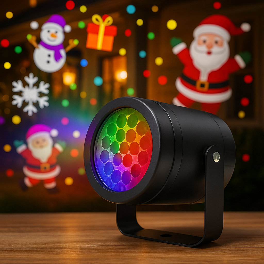O projetor transforma até os ambientes mais simples em um verdadeiro cenário natalino. Paredes ganham vida com neve, estrelas, Papai Noel e personagens encantadores. Do lado de fora, jardins e fachadas ficam iluminados como em parques temáticos.